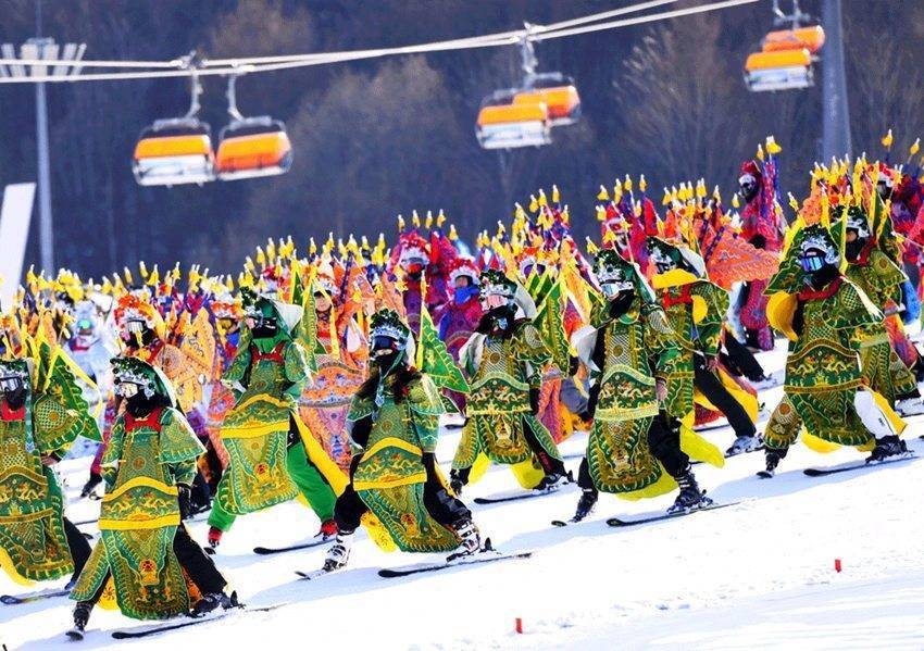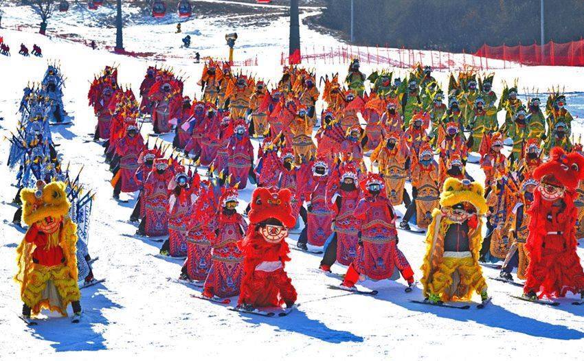 滑雪表演者穿着京剧和舞狮服饰,用飒爽身姿诠释大东冰雪魅力。