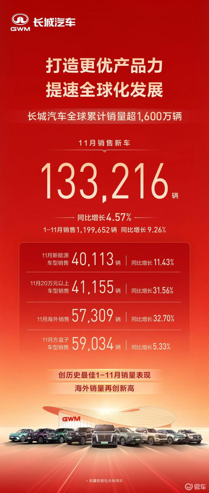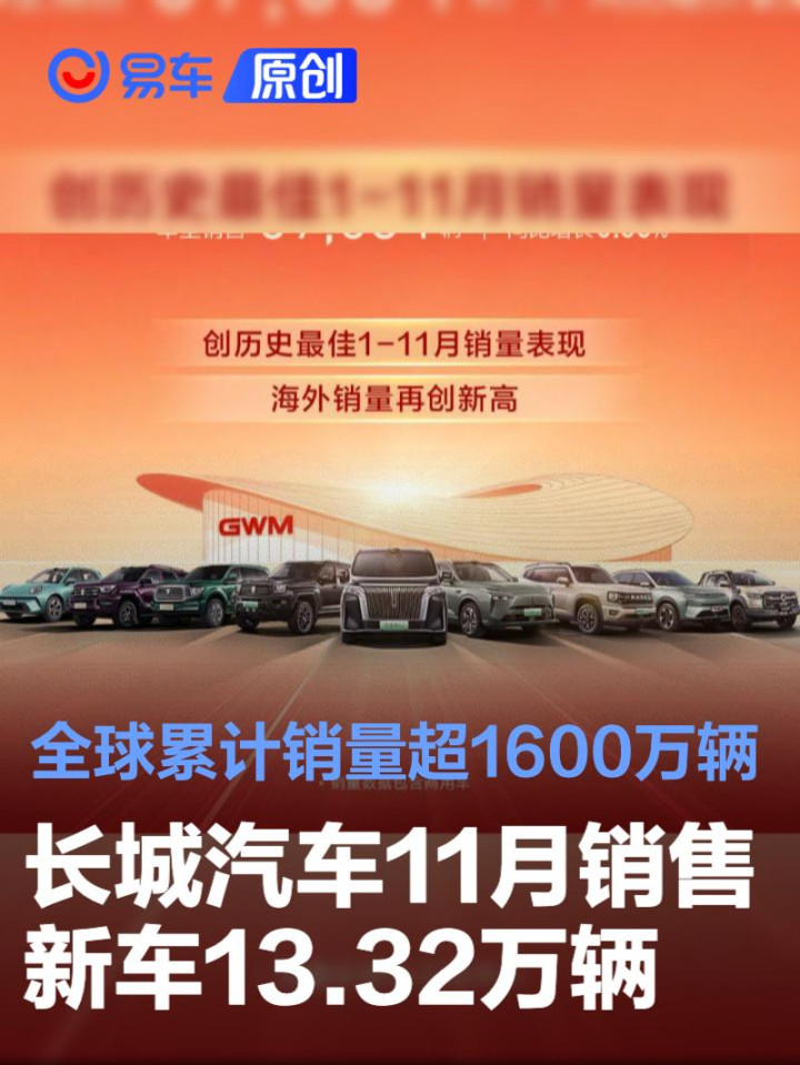易车讯12月1日,长城汽车公布最新销量数据,11月销售新车13.32万辆,同比增长4.57%,1-11月累计销售1199652辆,同比增长9.26%。截至11月,长城汽车全球累计销量超1600万辆。
