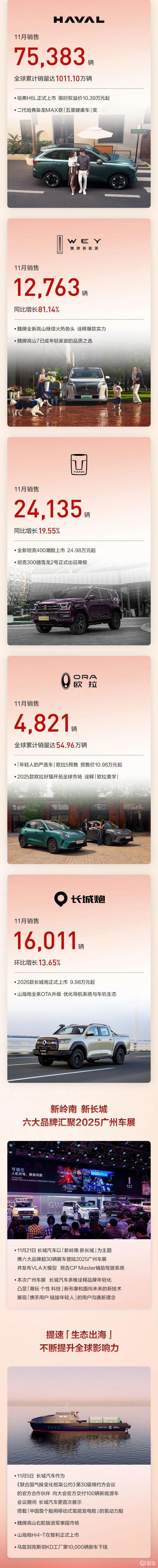 11月哈弗品牌销量75383辆;魏牌销售12763辆;坦克品牌24135辆;欧拉4821辆;长城炮16011辆。