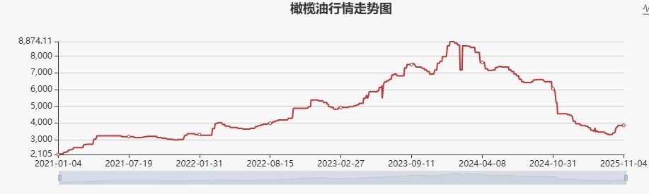 商务部商品价格网数据显示,2022年起,橄榄油价格呈明显上涨趋势,并于2023年底达到峰值。2024年价格开始回落,目前回落至2022年水平。最新数据显示,2025年11月11日橄榄油报价为3849.61欧元/吨,按即时汇率折算约31.72元/公斤(1欧元≈8.24元人民币)。
